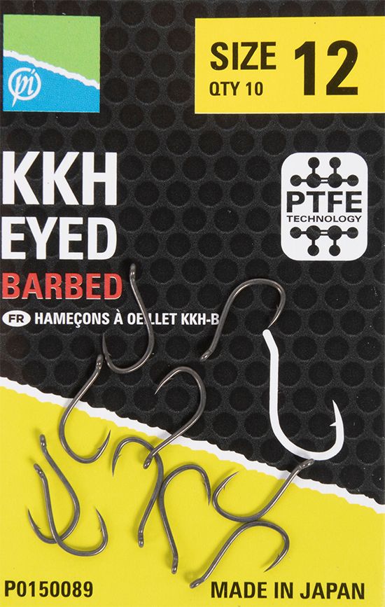 Preston KKH Eyed Barbed este o versiune bazata pe popularul model Preston KKM-B Barbless, avand un design agresiv special conceput pentru a asigura o intepare ferma. Acest carlig vine cu caracteristici importante care ofera un avantaj real fata de alte modele „barbed” (cu spin). Orientarea ochiului catre exterior creeaza un unghi unic, permitand o prezentare corecta si o capacitate sporita de intepare. Carligele sunt fabricate din otel carbon japonez de inalta calitate, acoperite cu un strat de PTFE care reduce semnificativ vizibilitatea carligului, reducand astfel sansele de a speria peste. De asemenea, varful ascutit al carligului, realizat cu ajutorul unei tehnologii speciale, ii confera o durata de viata indelungata
