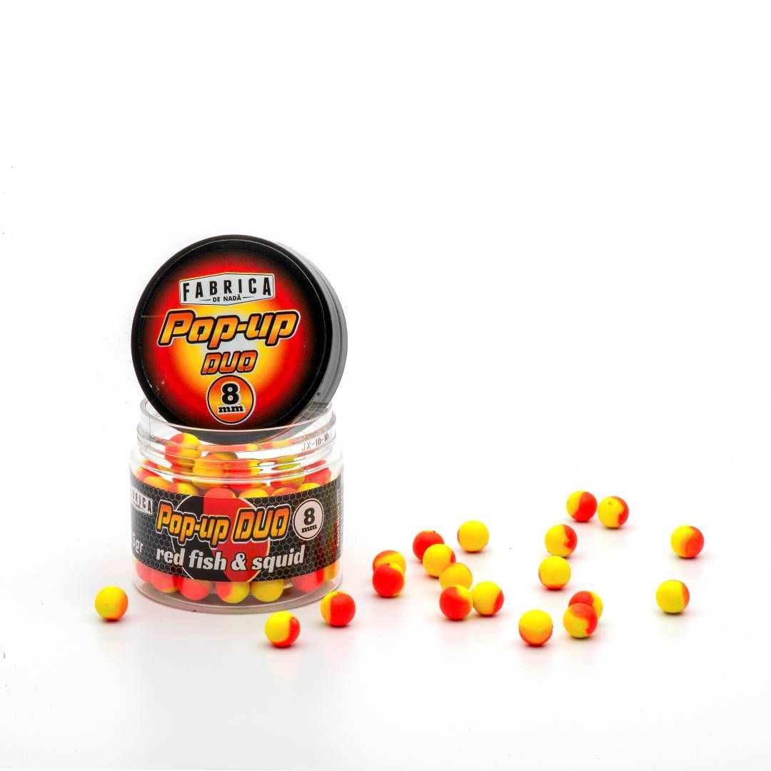 Pop-Up-urile Duo 8mm de la Fabrica de Nada sunt momeli inovatoare, produse dintr-un mix special care asigura o flotabilitate de lunga durata. Aceste pop-up-uri au fost testate de pescari experimentati si au demonstrat eficienta in orice anotimp. Caracterizate prin culori intense si o combinatie de arome atractive, pop-up-urile Duo sunt proiectate pentru a atrage pestii mari, in special crapul.